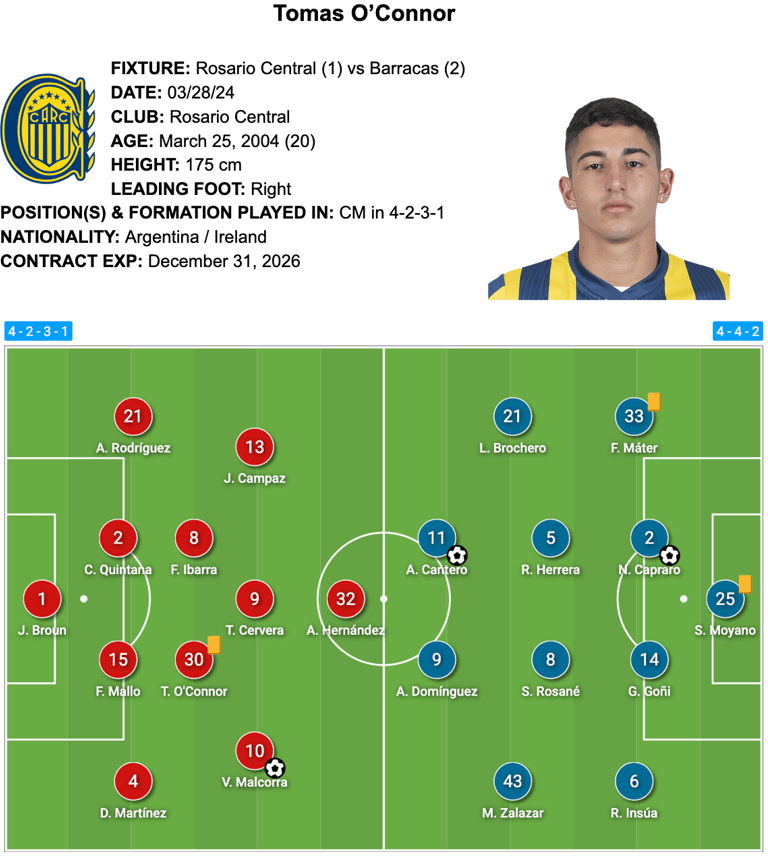 The player delivered a performance with moments of quality, showcasing his ability to influence the game through his ball carrying, distribution, and vision to identify spaces. His offensive contribution was consistent, providing passing options, advancing with the ball, and giving width to the team. He played a key role in playmaking through short passes and movement, also registering an assist after an effective carry. However, his insistence on dribbling in certain situations led to dangerous ball losses, compromising the team’s defensive structure.